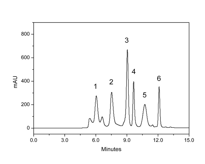 1. Thyroglobulin (甲状腺球蛋白), 670 kD 2. γ-Globulin (γ-球蛋白), 158 kD 3. Ovalbumin (卵清蛋白), 44kD 4. Myoglobin (肌红蛋白), 17.6 kD 5. Poly-DL-alanine (聚-DL-氨基丙酸), 1-5 kD 6. Vitamin B12(维生素B12), 1.35 kD |