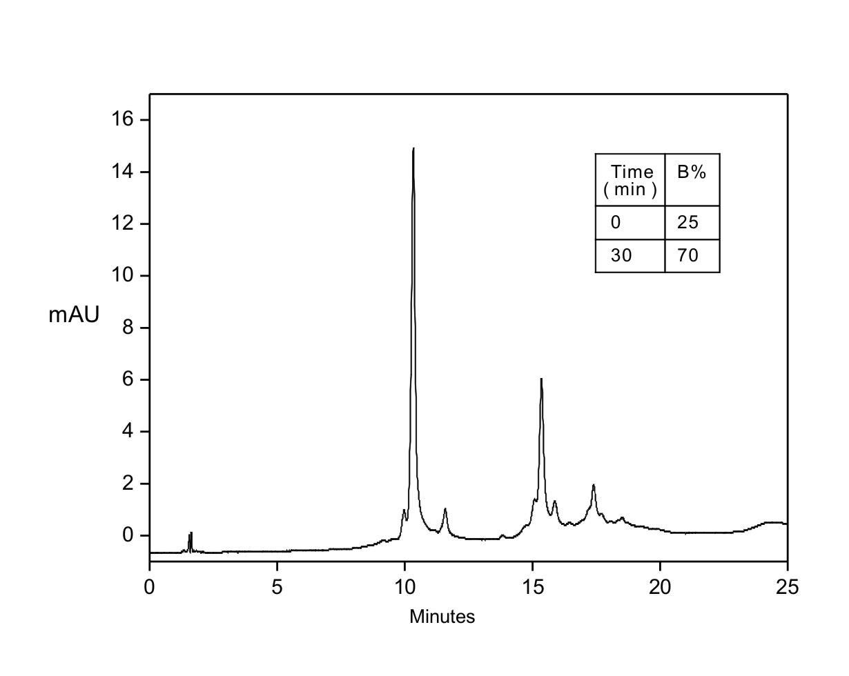 | Mobile phase: | A: 16 mM MES + 10 mM MOPS + 12 mM TAPS + 10 mM CAPSO + 30 mM NaCl, pH 5.2 by NaOH; B: 10 mM MES + 12 mM MOPS + 14 mM TAPS + 16 mM CAPSO + 30 mM NaCl, pH 10.2 by NaOH |