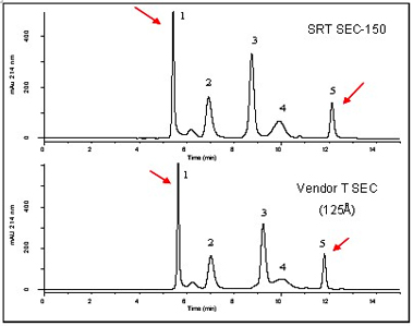 Sepax BR-C18柱使用的是被完全覆盖的键合硅胶填料,因此即使在高pH环境下仍具有优异的化学稳定性。下图是对测试化合物甲苯以55%乙腈-45%水(pH10)为流动相运行18,000倍柱体积后得到的结果,可见保留时间高度重现。如此高的稳定性使Sepax BR-C18柱特别适用于许多分析物的确认。Sepax BR-C18独有的化学键合技术使其具有高选择性和高分离效率的特点。