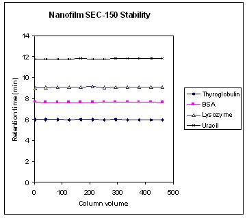 Nanofilm SEC固定相具有致密的涂层键合密度,因此可阻止任意分子破坏硅胶与固定相之间的键合,从而保证填料具有高的稳定性。Nanofilm SEC固定相可用于多种缓冲液中,如醋酸铵、磷酸盐、Tris等。当用150和100mM的磷酸缓冲液(pH7.0)作为流动相时,在3个月或进样1000次后Nanofilm SEC柱的性能仅会发生轻微的改变,保留时间的偏差在5%以内。图5是Nanofilm SEC-150在1、5和10天,每天运行10小时得到的结果。从图中可以看到流出曲线基本重合。图6是两周内蛋白和一个小分子在500倍柱体积内保留时间的变化情况。从图中可以看到保留时间变化的差异非常小。 Nanofilm SEC固定相可在高盐浓度,如1.0M下使用。另外,Nanofilm SEC柱在有机溶剂如甲醇、乙醇、THF、DMF、DMSO等中,以及其与水的混和溶液中也相当稳定。 Nanofilm SEC柱在pH 2-8.5范围内稳定。另外,在短时间内也可以耐受高的pH,如pH 8.5-10。 Nanofilm SEC柱在温度耐受方面表现突出。最高工作温度可达到80°C。