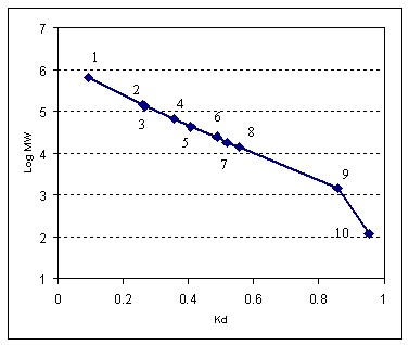 样品:1. 甲状腺球状蛋白(670kD), 2. IgG(150kD), 3. BSA双聚体(132kD), 4. BSA (66kD), 5. 卵清蛋白(44kD), 6. 肌红蛋白(17.6kD), 7. 溶菌酶(14.3kD), 8. B12 (1.35kD), 9. 尿嘧啶(120D)