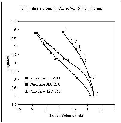 | 固定相 | Nanofilm SEC-150 | Nanofilm SEC-250 | Nanofilm SEC-500 | Nanofilm SEC-1000 |