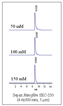 对于生物分离而言,生物分子与填料之间的非特异性相互作用往往会导致低的分离效率,如色谱峰拖尾以及低的回收率等。Nanofilm SEC填料所采用的独特的表面化学技术可以在硅胶表面共价键合一层均匀的聚合物链。这种固定相具有中性和亲水的性质,因此可以最大限度消除填料基质与生物分子,其中尤其是与蛋白之间的非特异性相互作用。这种经过特别设计的涂层可以使Nanofilm SEC柱获得高的分辨率和分离效率。例如,以尿嘧啶作为测试物可以获得高达每米90,000的理论塔板数(见表1)。