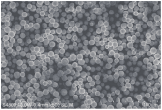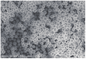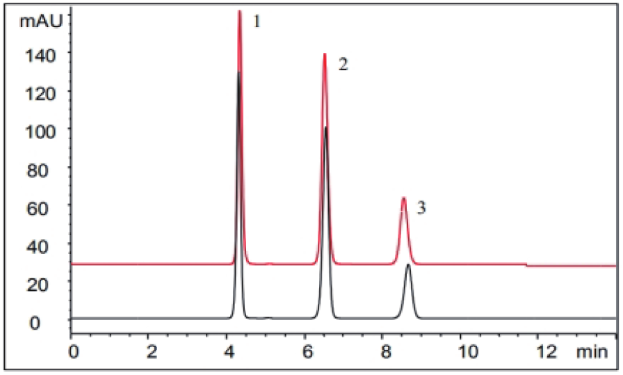 用反复填装 4 次 50x250 mm 规格制备柱的填料再次填装成 4.6x250 mm 规格分析柱,测试图谱见图1中红色线条;填料的电镜图见图 2 中 A。