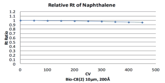 通过500 CV的碱性溶液在位清洗,发现萘相对于其初始保留时间的比值为95%,这说明Bio-C8(2)填料只发生了轻微的退化。