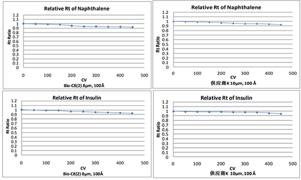 ● 通过 450 CV 的碱性溶液在位清洗,发现萘以及胰岛素相对于其初始保留时间的比值为 92%,这说明Bio-C8(2)填料只发生了轻微的退化 ( Bio-C8(2)与供应商 K 填料性能类似 )。