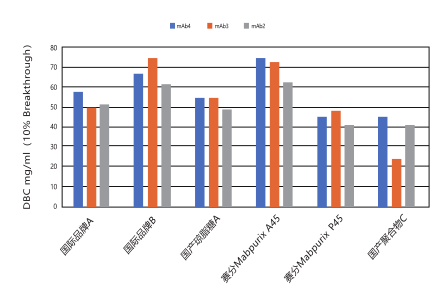 1. 动态载量测试方法:2 mg/mL Human IgG,A45以5 min驻留时间、A65、A65 Excel以6 min驻留时间,载量以 10% 流穿计。