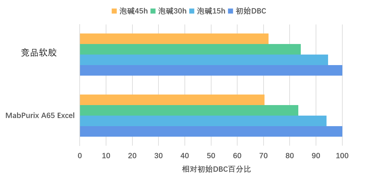 MabPurix A65 Excel耐碱性能与竞品软胶相近,0.5 M NaOH泡碱45h后维持初始值的70%以上
